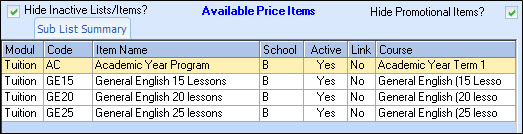 Sub Price List items: