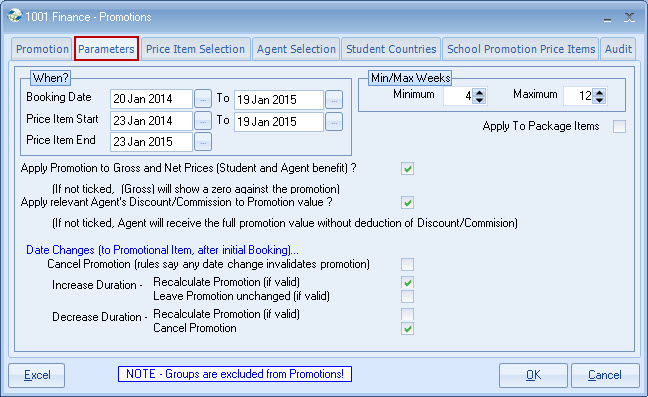which free weeks apply is controlled by the min/max weeks in the Promotion Parameters tab.