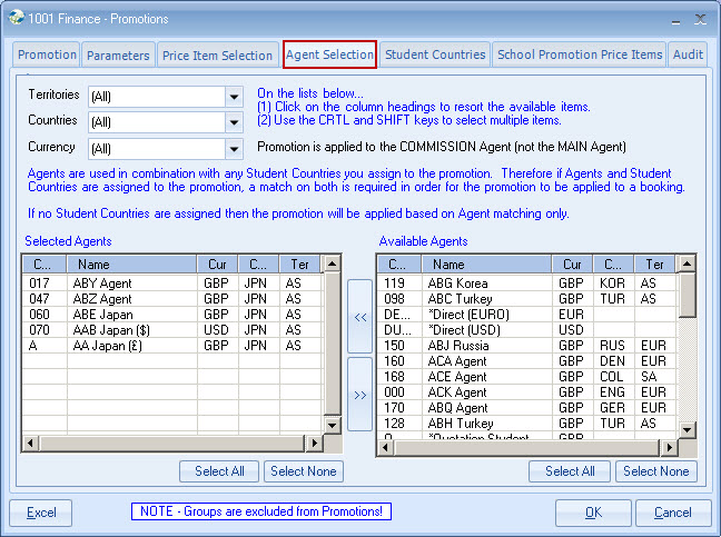 Typically the agent(s) would also be added, so in the example above, if the promotion was to apply only to direct bookings, then the Direct Booking agents would also need selecting. Below is an example of the promotion being only for Direct (USD) Students. (Multiple agents may also be selected).