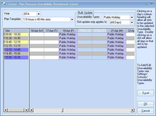 Enter school holidays/closures for each year.