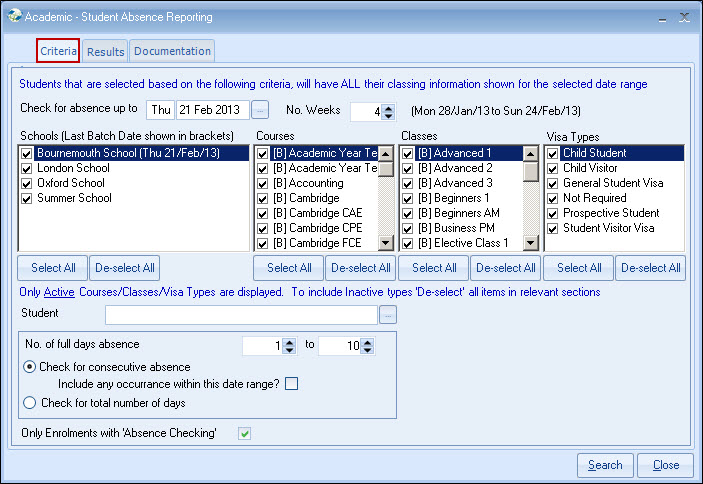 absence has been entered, and also the number of weeks Class is to check back
