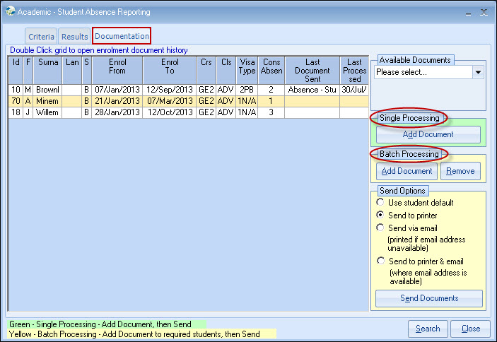Each student can have documents selected and either sent