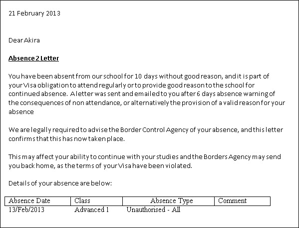 is a sample showing how Class could produce a letter giving details of absence