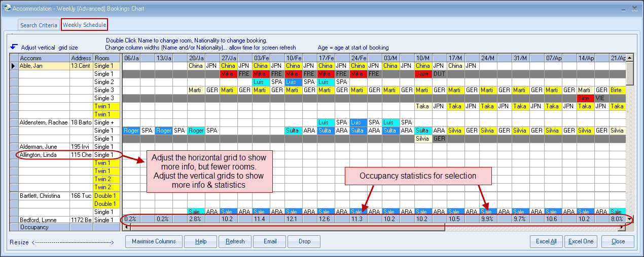 are occupied/free, at a specific (or all) accommodation(s), on a weekly basis.