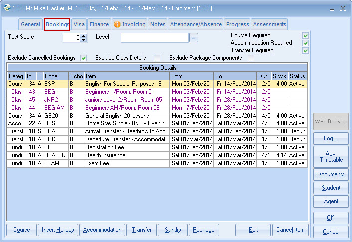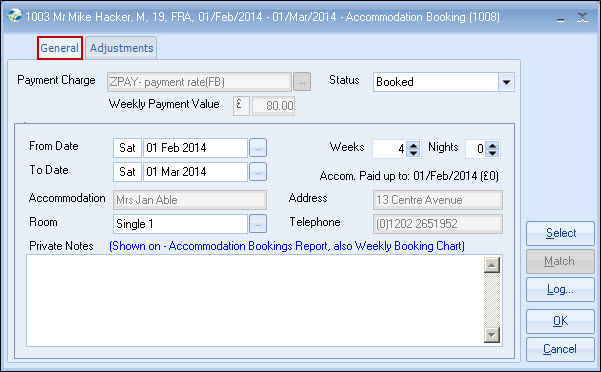 2. Double-click the student to display the booking details (which may be updated, eg. room change). The change will only show if the display is refreshed