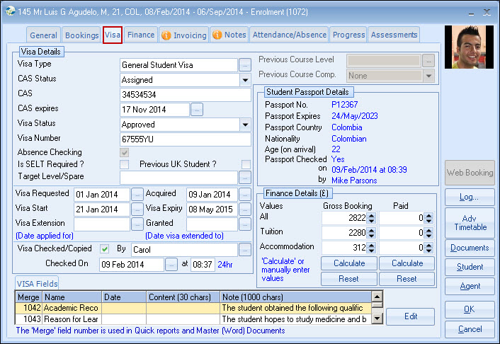 All values can be manually overridden to allow external values to be entered. For example the Agent may advise that the student has already paid him, but the agent may not have paid the school, so in Class the entry would show as unpaid. You may wish to amend the values to reflect payment by the student to the Agent. The payment values entered are unrelated to the values entered in the Ledger. The "Reset" button will restore values to the position they were on entry to the Visa screen (effectively cancelling out all changes).