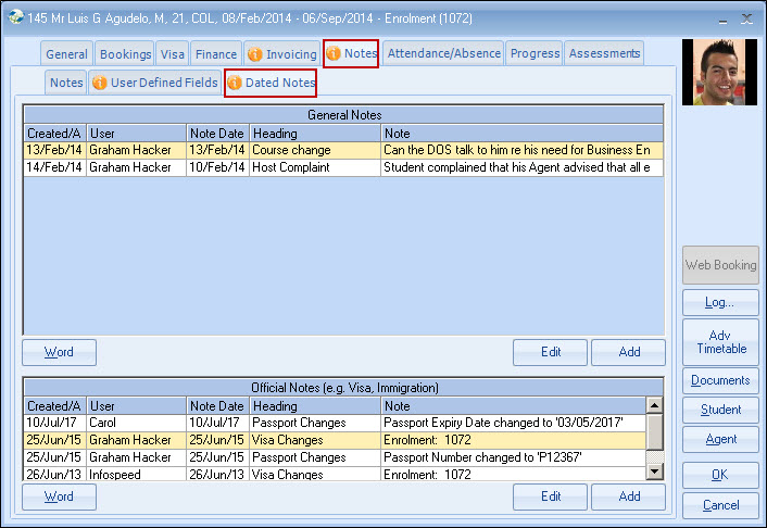 This allows for "Official" notes (which includes a log of all changes to Passport and Visa details) to be kept separate from other general information (This makes it easier for any Border Agency to inspect only relevant information).