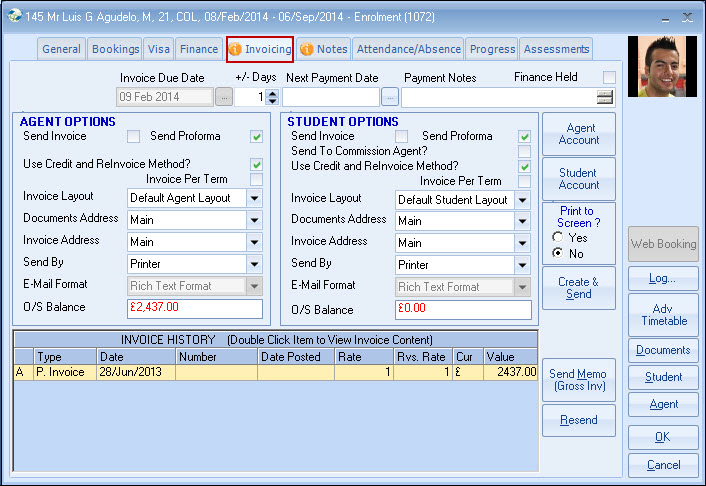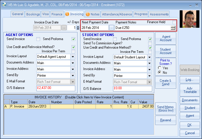 Invoicing Invoice Due Date Next Payment Date Payment Notes Finance Held Agent Documents Address Invoice Address Method Format for email Student As per above