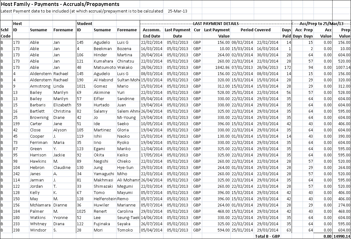 with an accrual/prepayment list for accommodation prepayments.