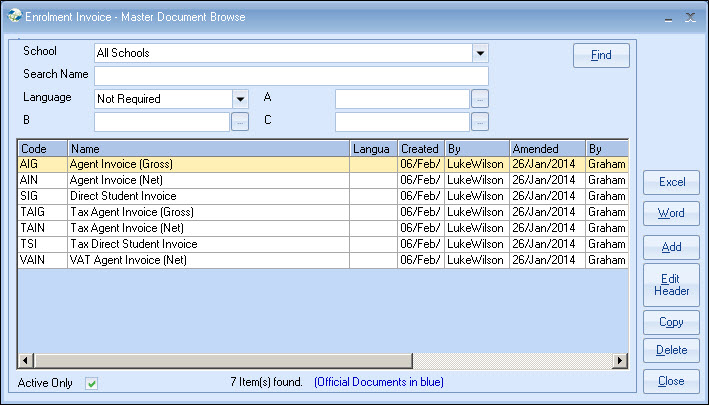 Invoice Documents All "Documents" work in the same way, so please refer to Enrolments