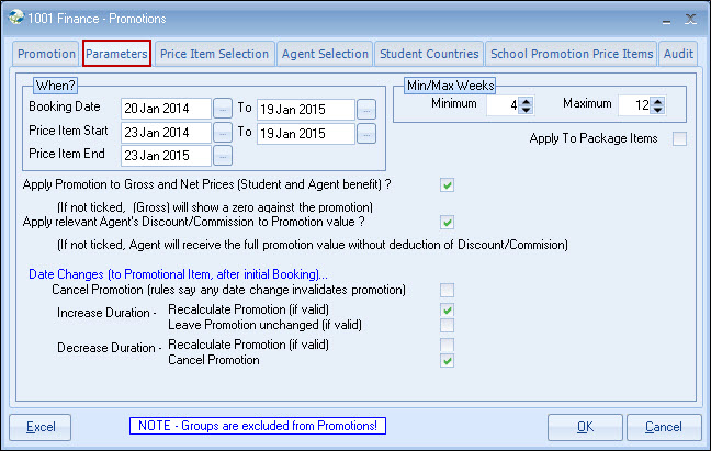 which free weeks apply is controlled by the min/max weeks in the Promotion Parameters tab.