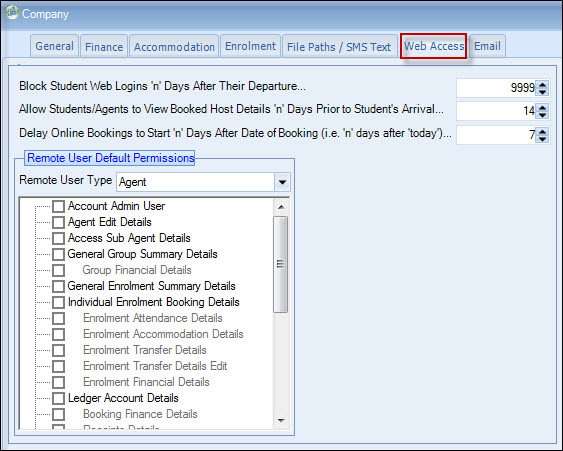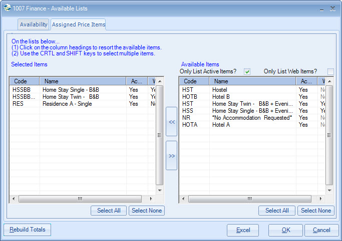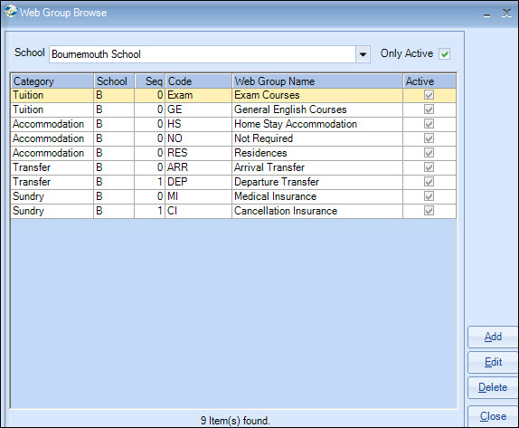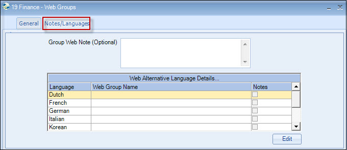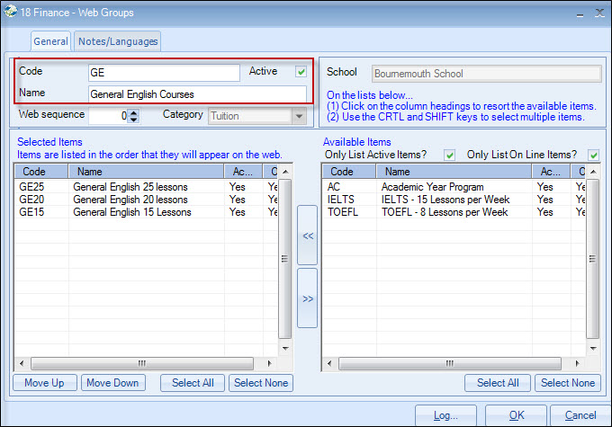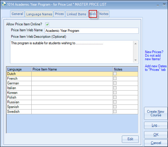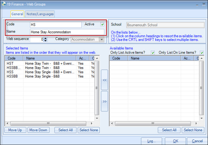 Tick Items that are to appear online and set "Web Language" name if required. The Notes option enables the web page to optionally display explanatory notes (in the appropriate language) against the selected item.